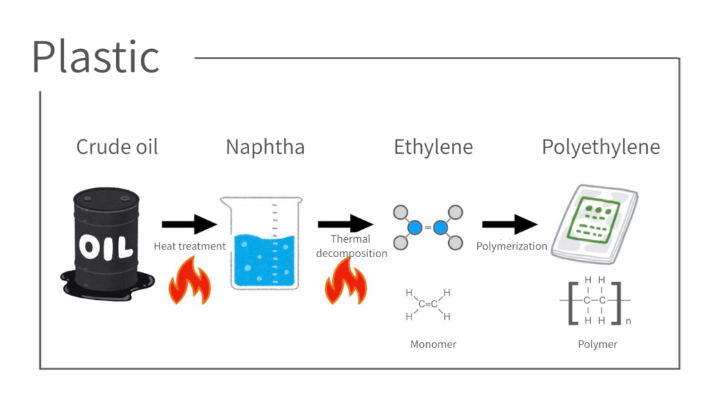 Naphtha, which is produced by heating crude oil, is thermally decomposed to extract ethylene, which is mixed with a catalyst and chemically reacted at high temperatures and pressures to produce polyethylene.